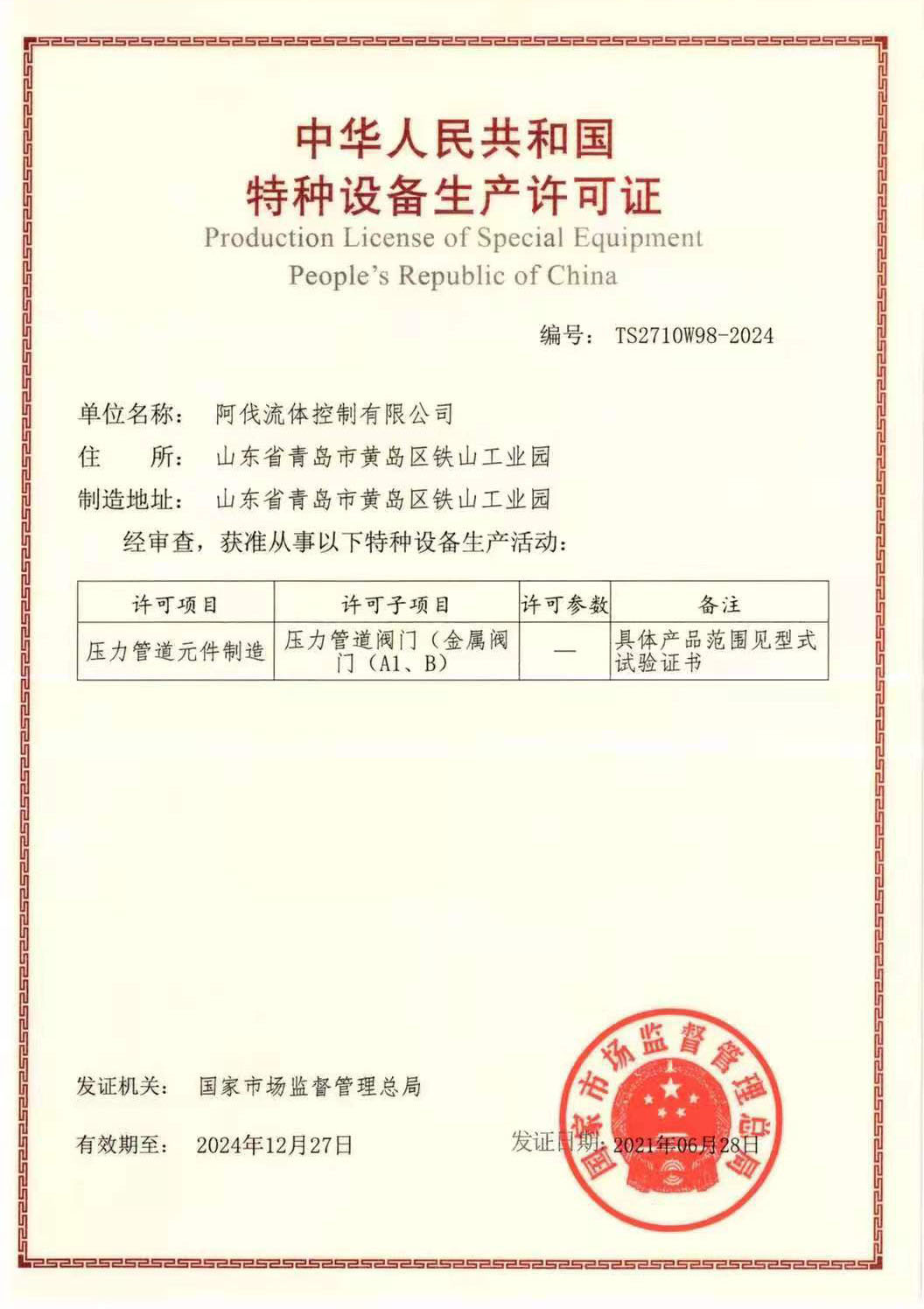 2021年7月5,新换发特种设备制造许可证(压力管道元件:金属阀门(A1、B)已发至我们公司。